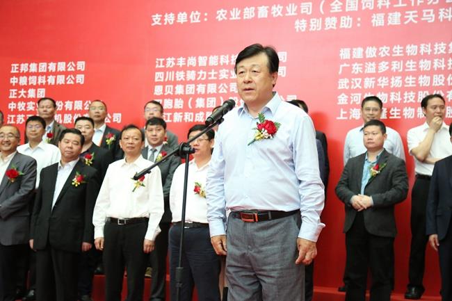 上圖為全國畜牧總站站長、中國飼料工業協會秘書長楊振海主持展會開幕式
