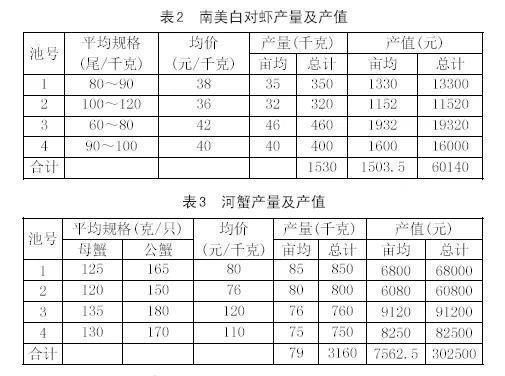 (2)產值:四個塘口南美白對蝦和河蟹的總產值362640元。