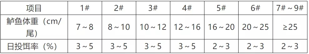 ? 根據(jù)存池鱸魚(yú)規(guī)格及數(shù)量,參考投餌參考表中推算投餌量,再根據(jù)天氣、水溫、水質(zhì)、鱸魚(yú)攝食及健康狀況等予以適當(dāng)調(diào)整。